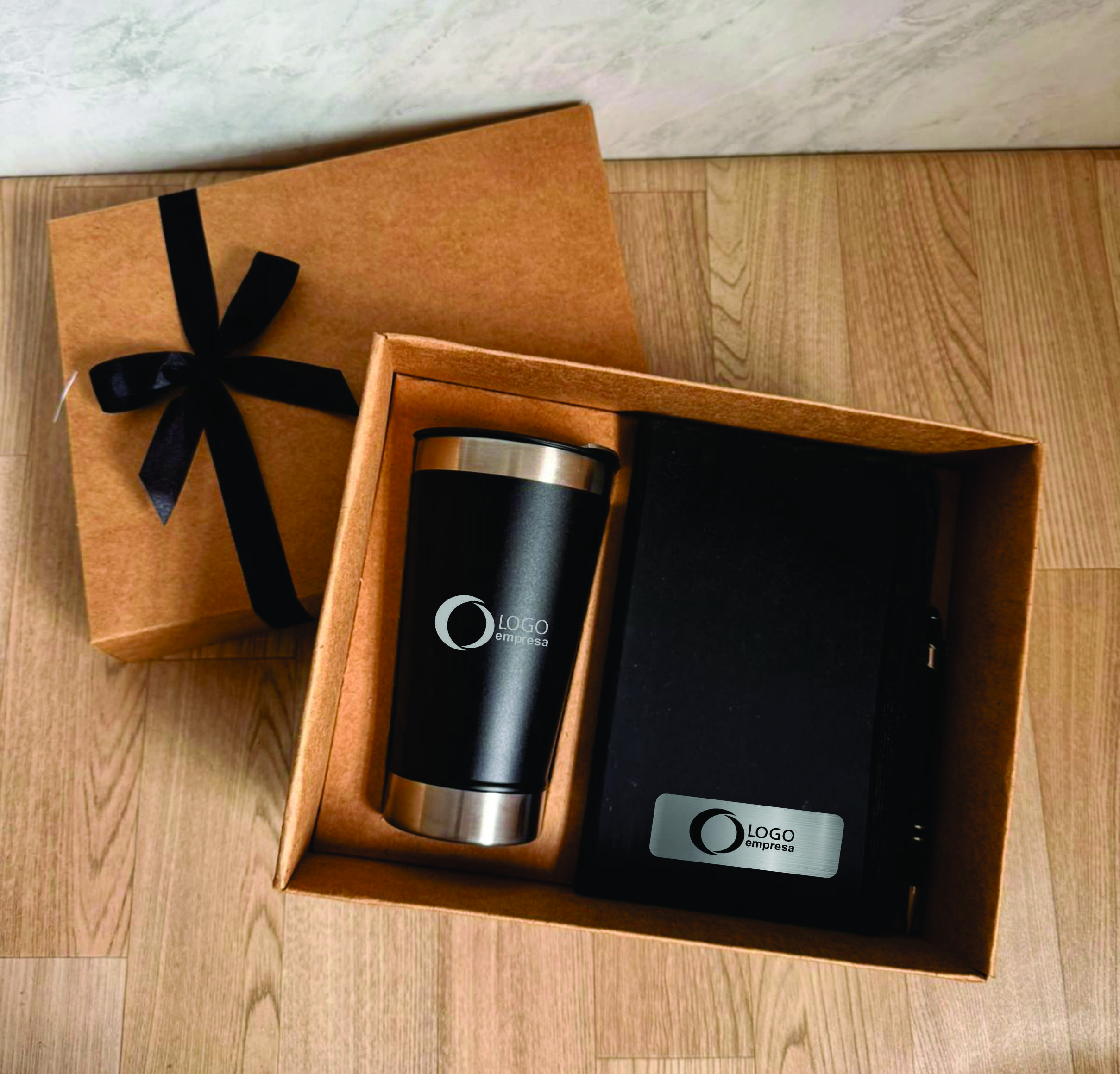 ACOMPANHA CAIXA COM 1 COPO TERMICOS TIPO STANLEY (SEM LOGO DA MARCA) COM GRVAÇÃO A LASER OU DTF UV, MOLESKINE 21X14 CM COM PAUTA E CANETA DE METAL GRAVADA A LASER